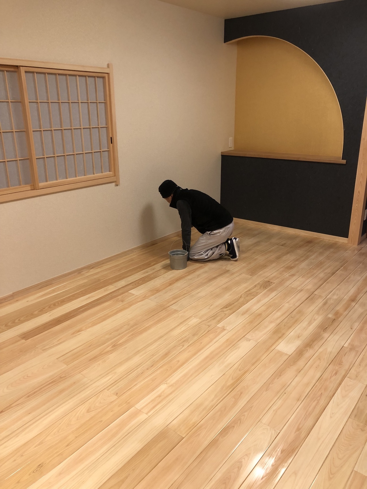 仕上げ材の選定をします。今回1番悩んだのがフローリング!大工の棟梁の勧めもあって桧の無垢材を使用することに。左の上の方は塗装した時にどのような色になるか試験塗りを行った跡です。